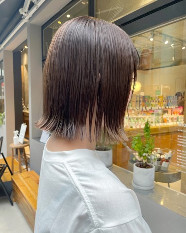 切りっぱなしボブ×フォレストブラウン 全体にストレートもかけて日頃も楽に扱いやすく◎ 切りっぱなしボブでさらに扱いやすいです♪ カラーは赤みのないブラウンで涼しげな印象に◎