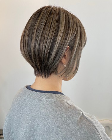 白髪ぼかしハイライトショート お手入れ簡単なショートボブにハイライトをしっかり入れてオンカラー。 ベースとのコントラストが出るデザインで脱白髪染めが叶うカラーリングです。